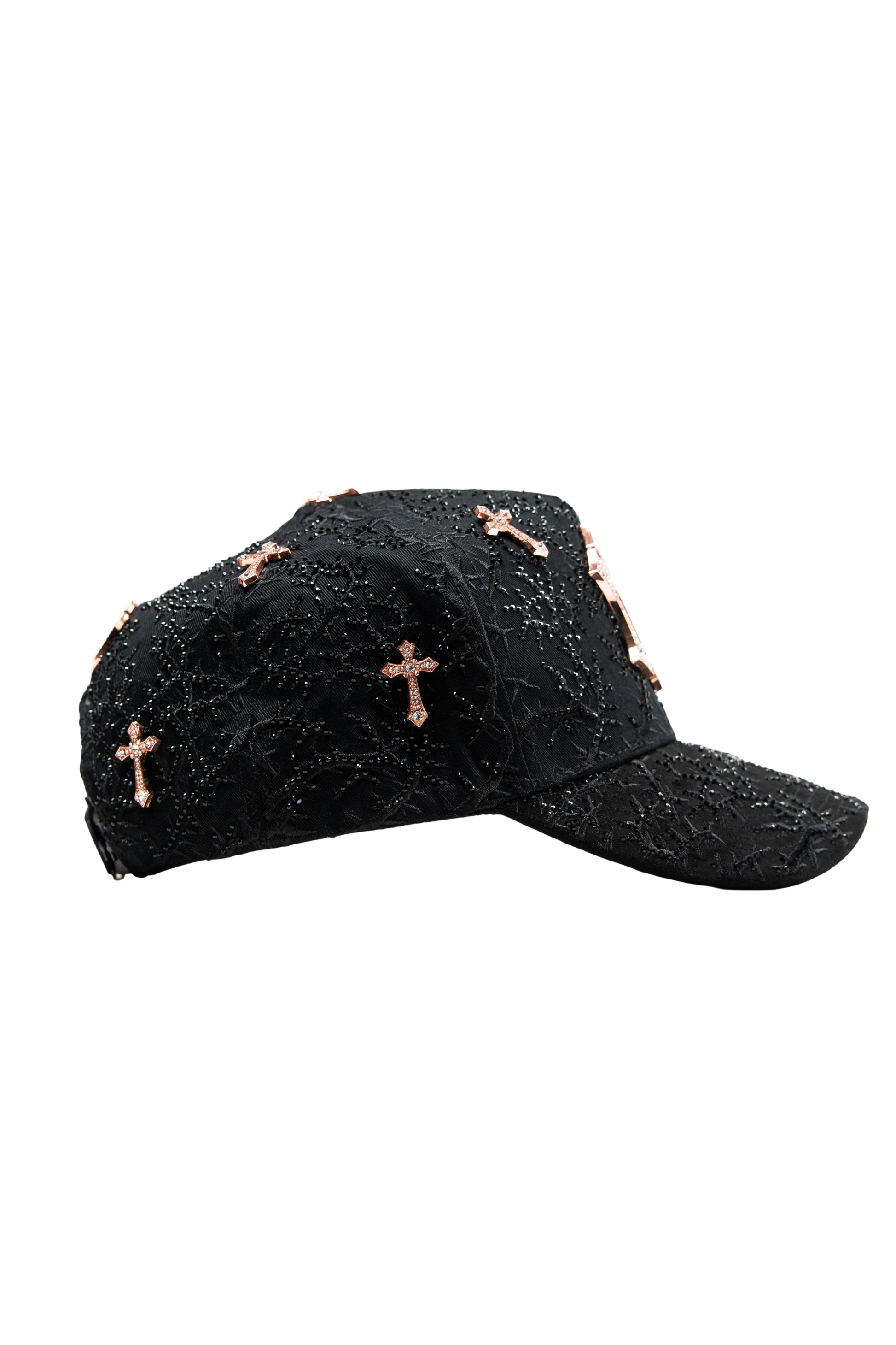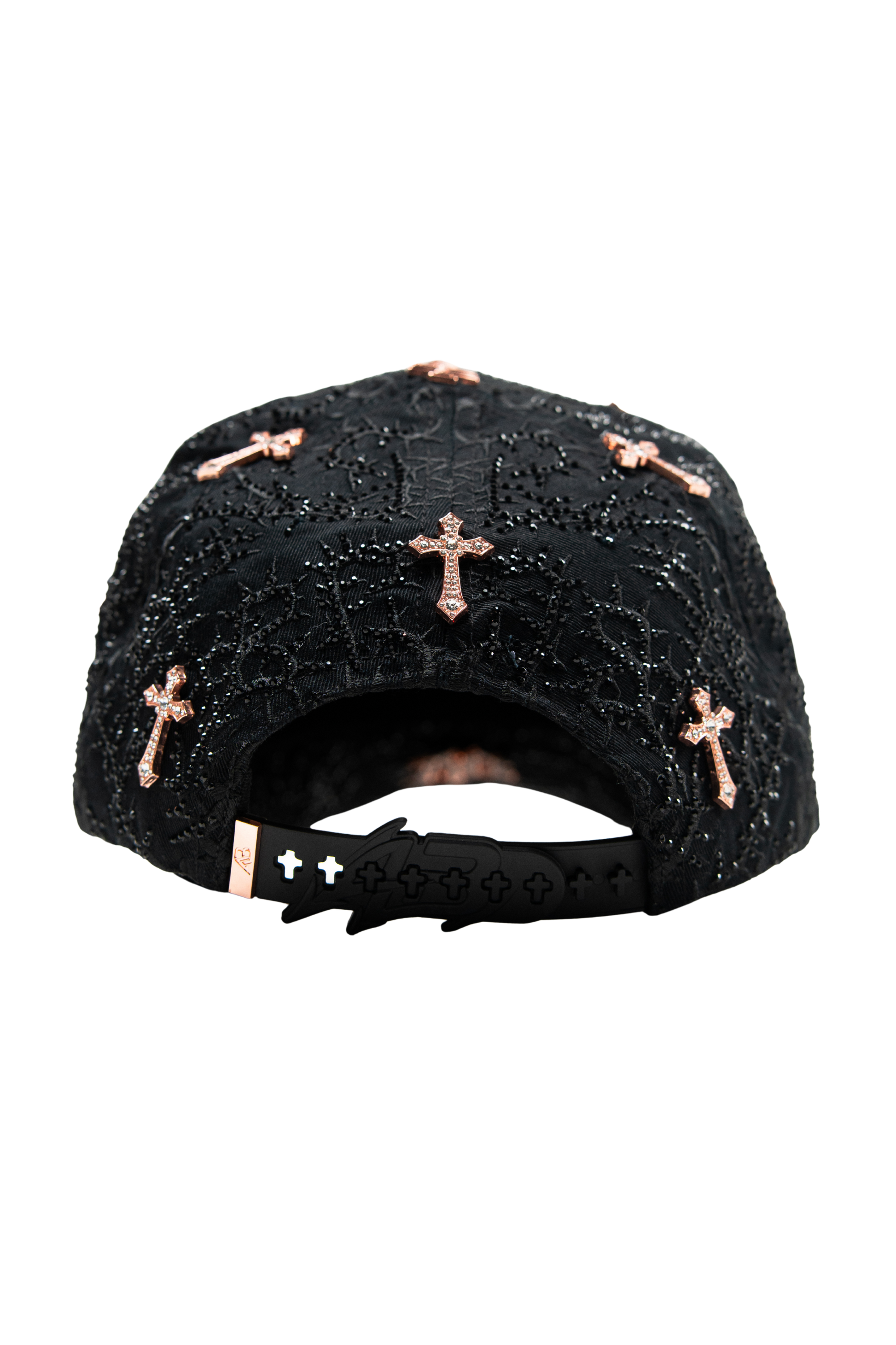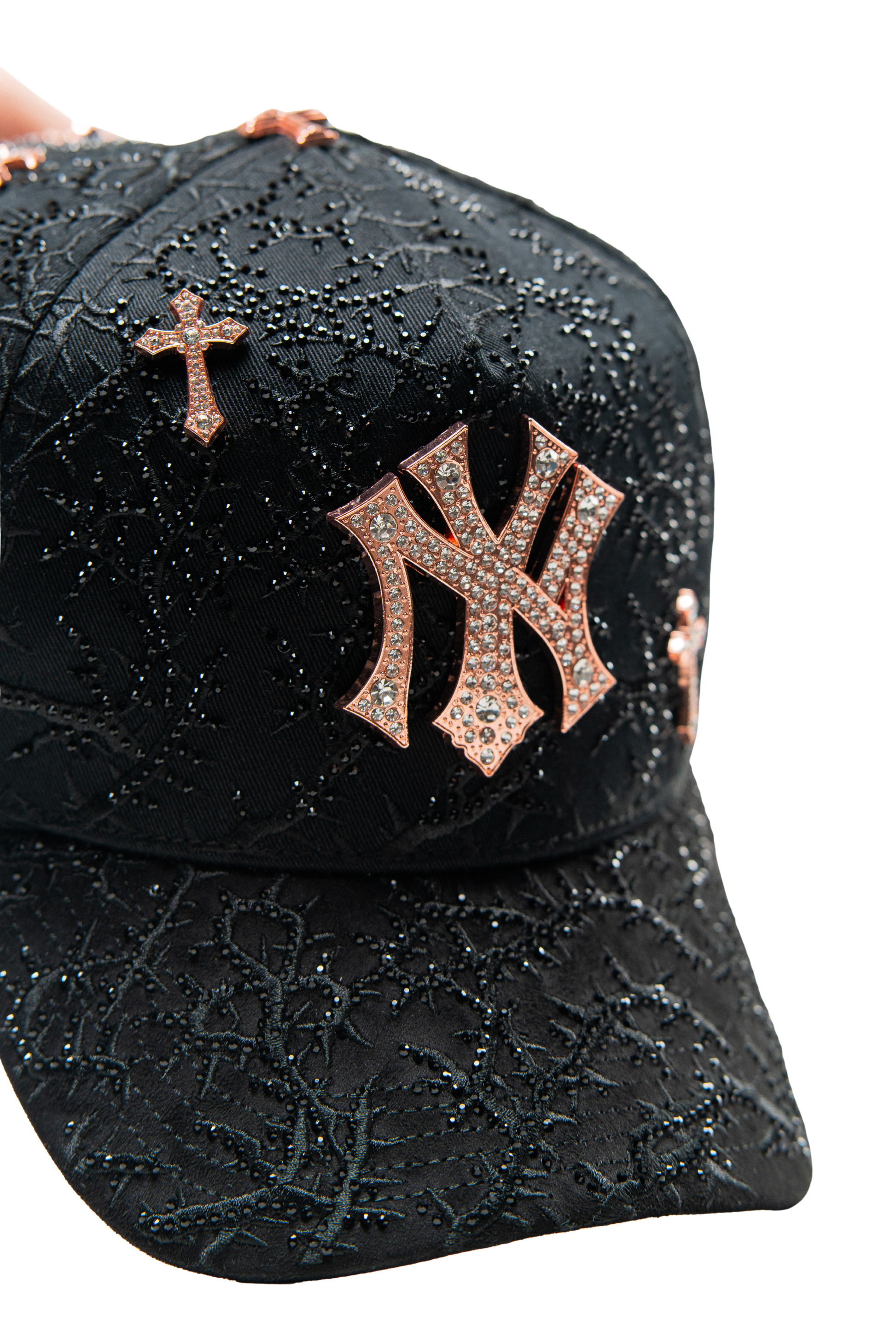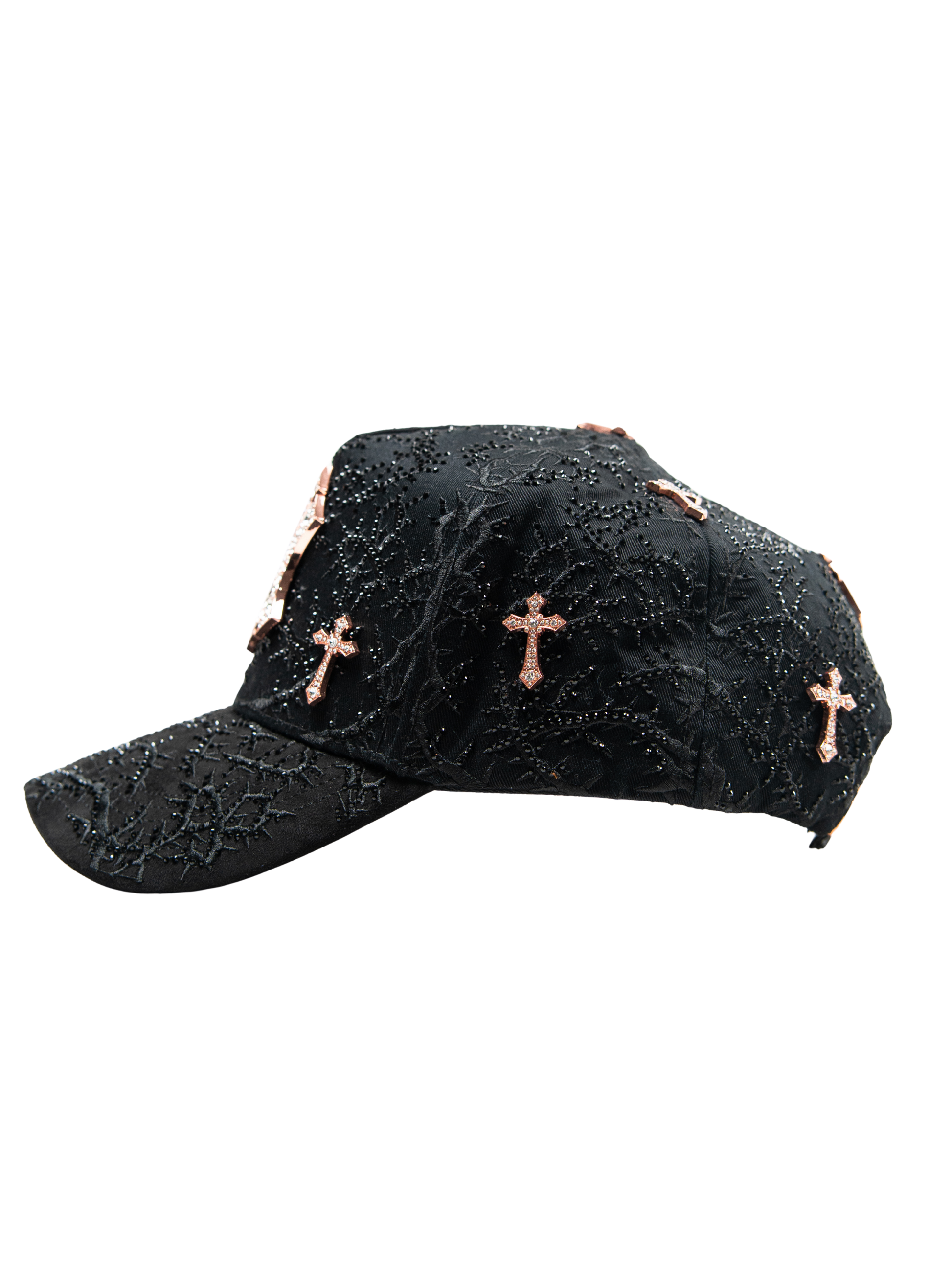 No es solo una gorra… es una pieza que impone.Base negra con textura thorned, detalles en relieve y acabados en rose gold 24K que elevan el diseño a otro nivel.Cada cruz, cada brillo, cada detalle está hecho para destacar sin decir una palabra.